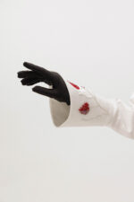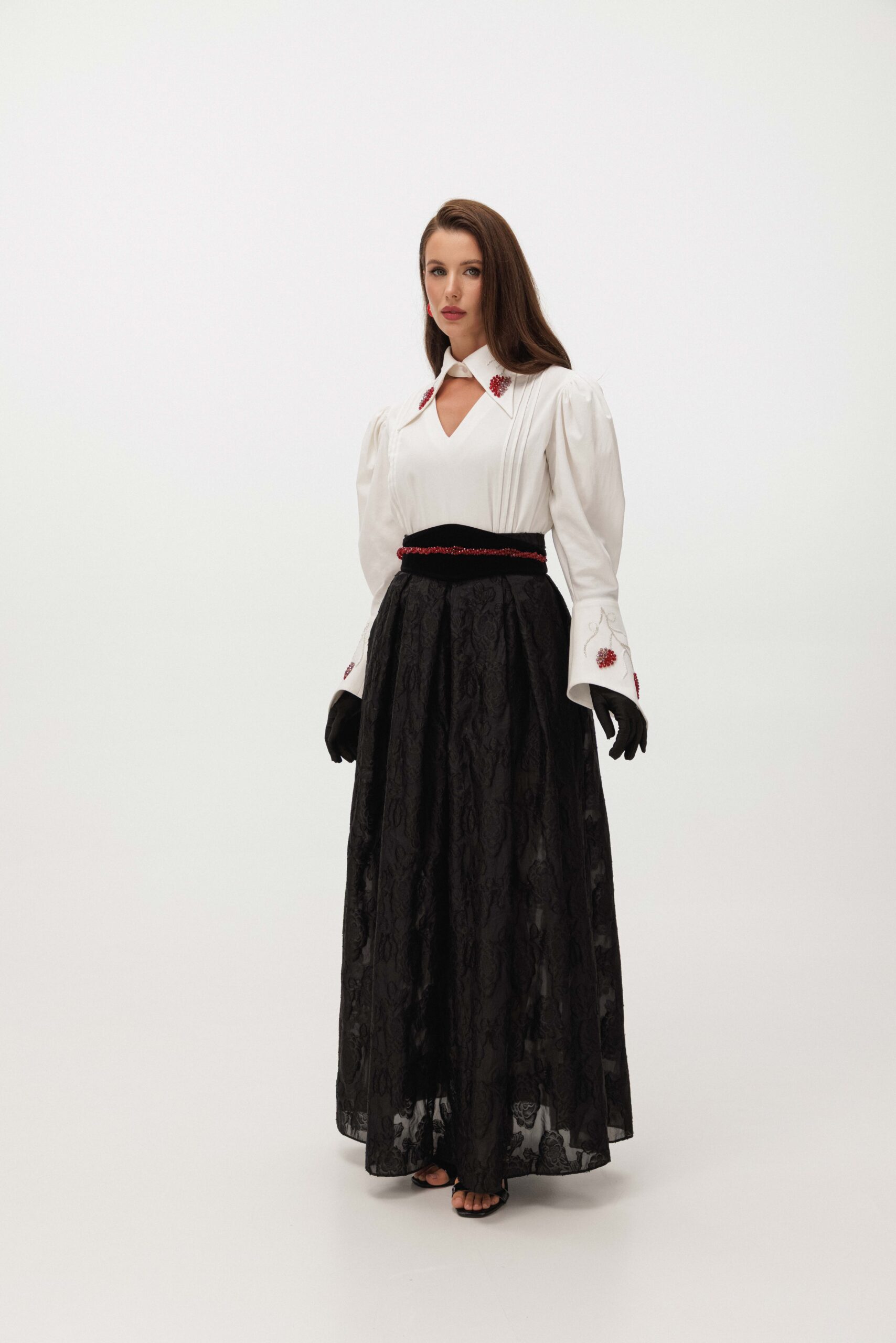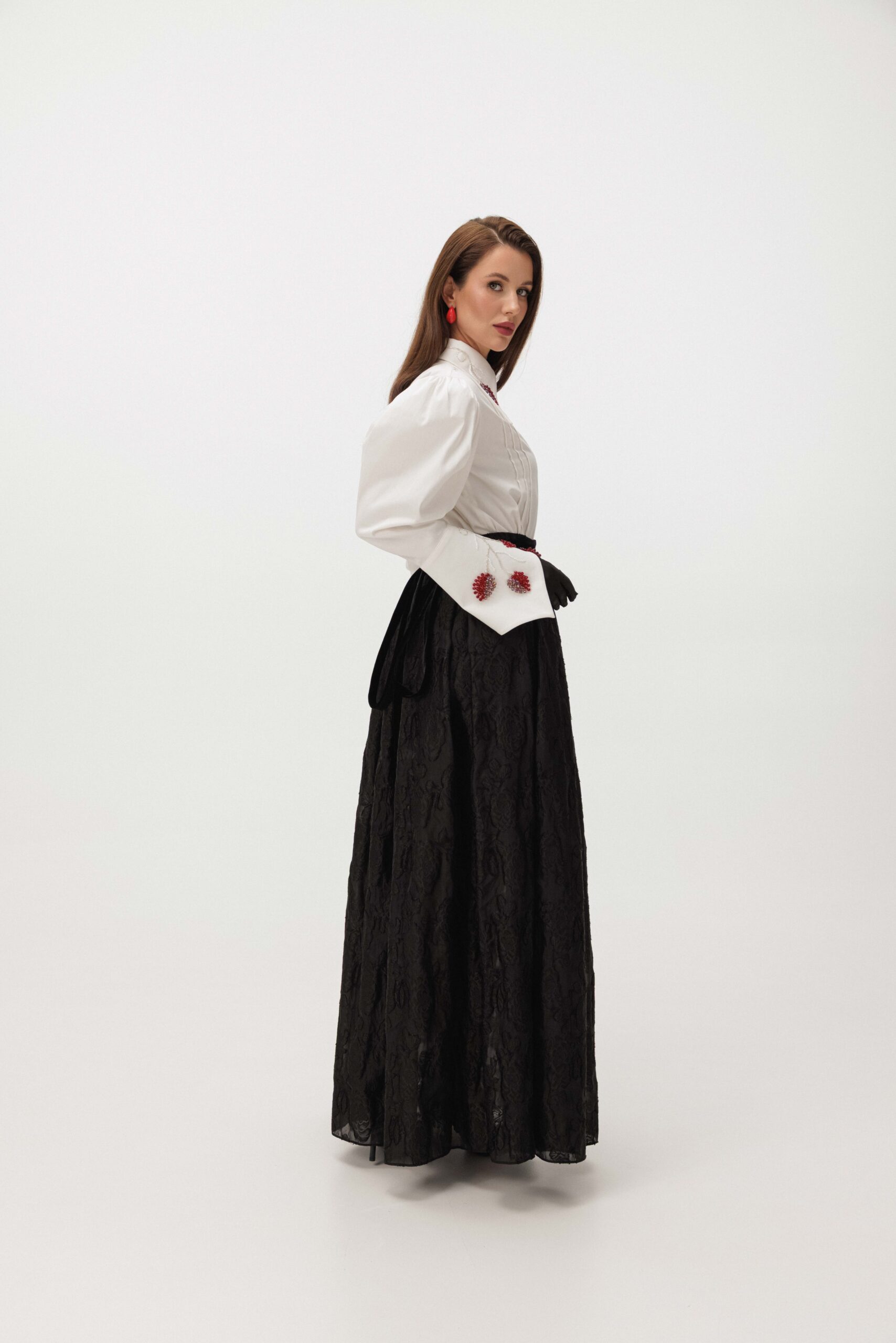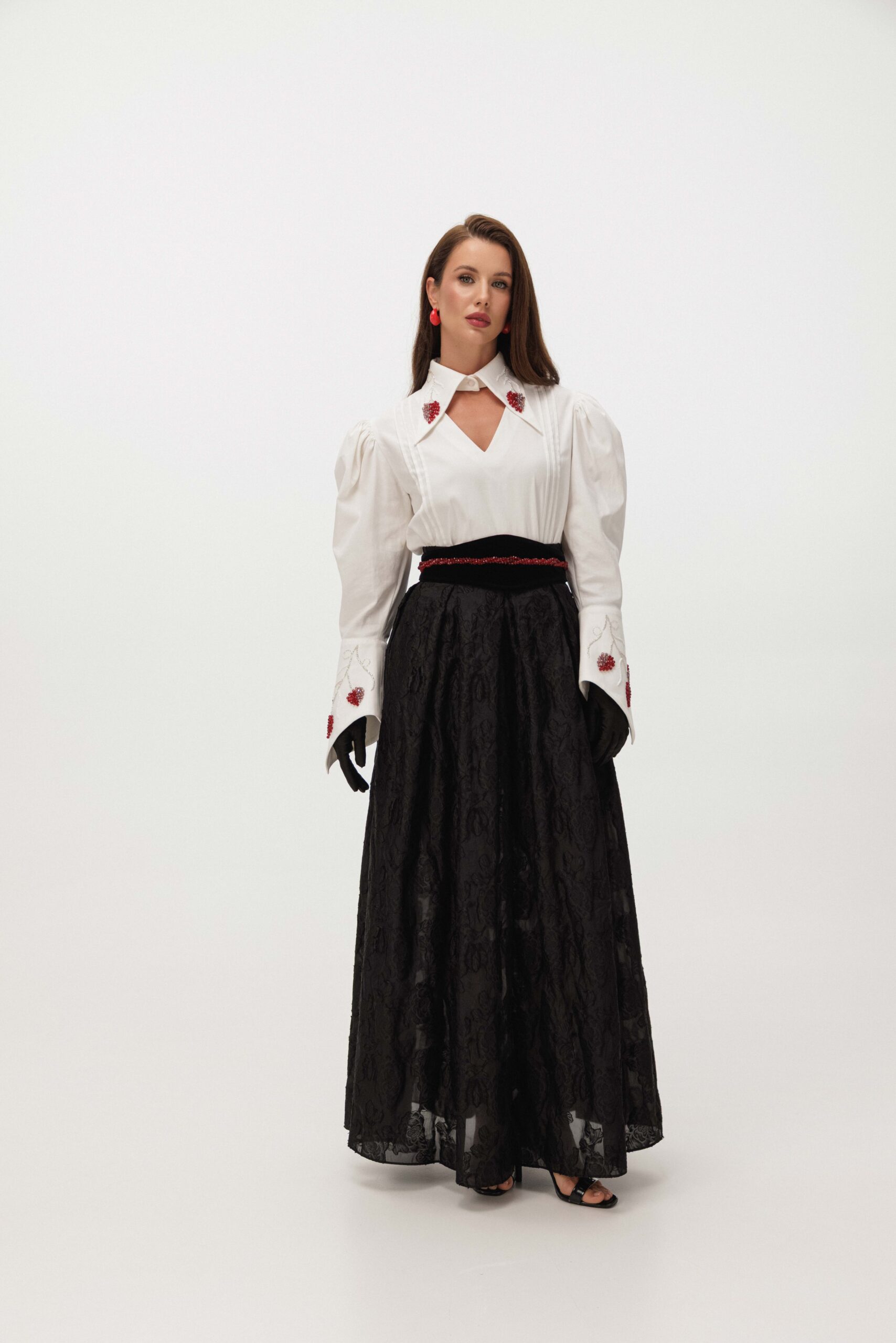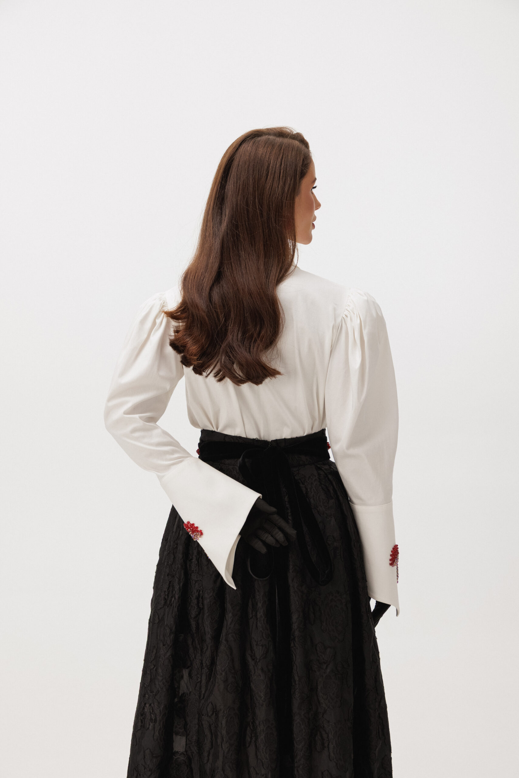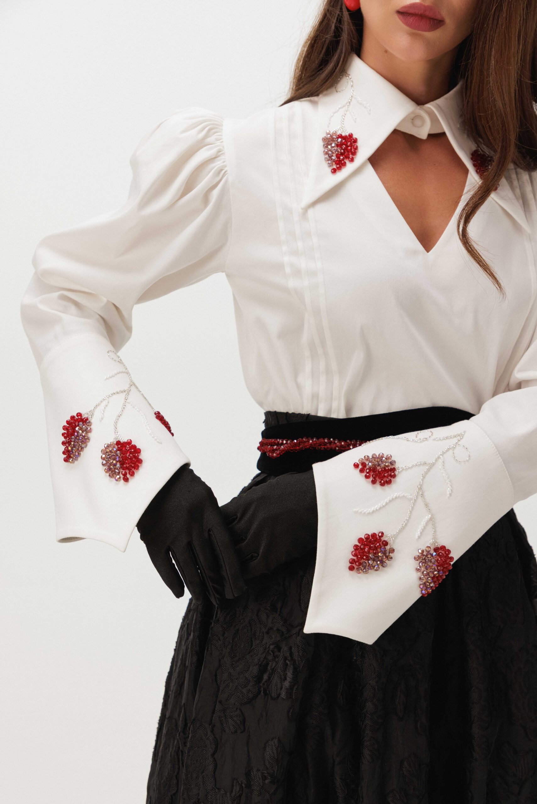 Особлива увага — до деталей: комір та манжети прикрашені ручною вишивкою бісером у вигляді виноградних грон — символу родючості та життєвої сили.