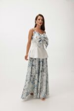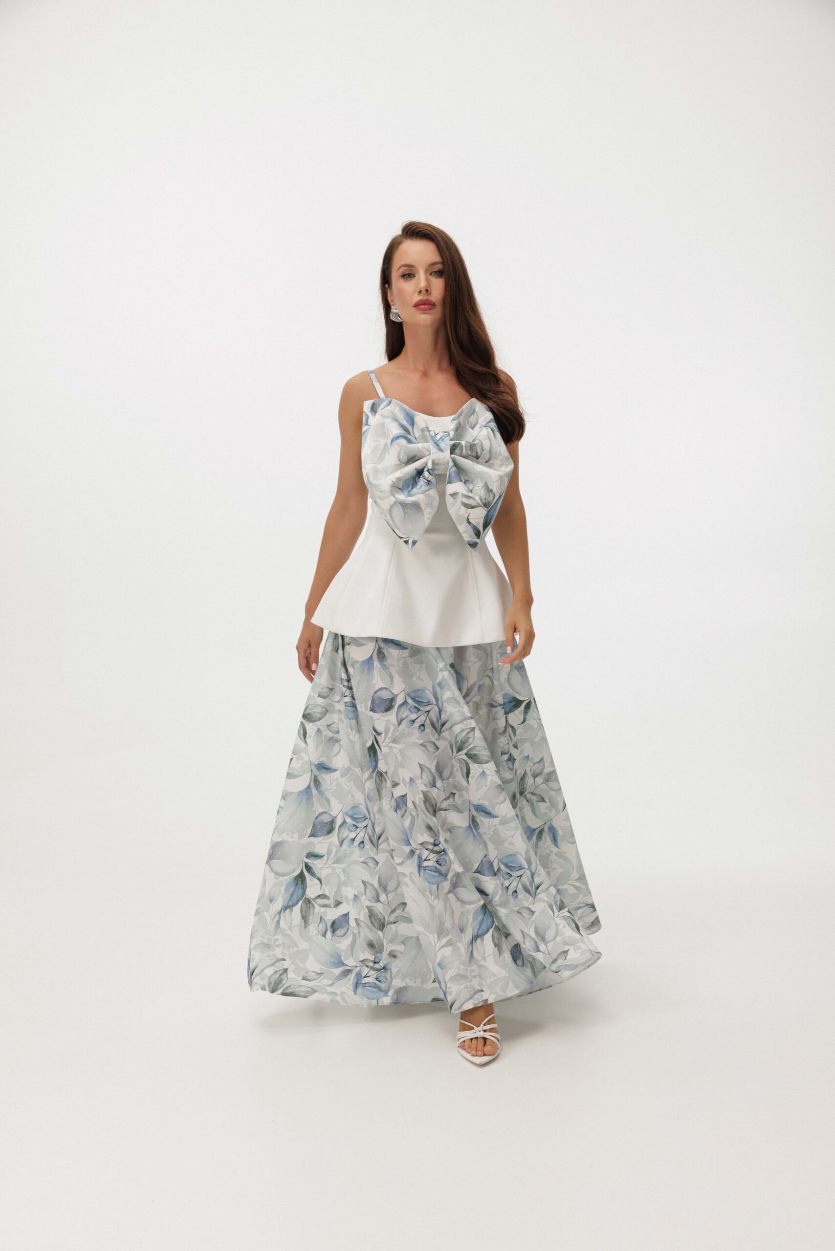 Декорована дрібними складками від лінії талії, створюючи легкий і повітряний силует.