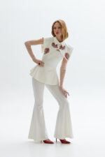 Молочно-білий тотал-лук, сформований довершеною взаємодією архітектурного корсета, штанів-кльош та розкішної вишитої маніжки.