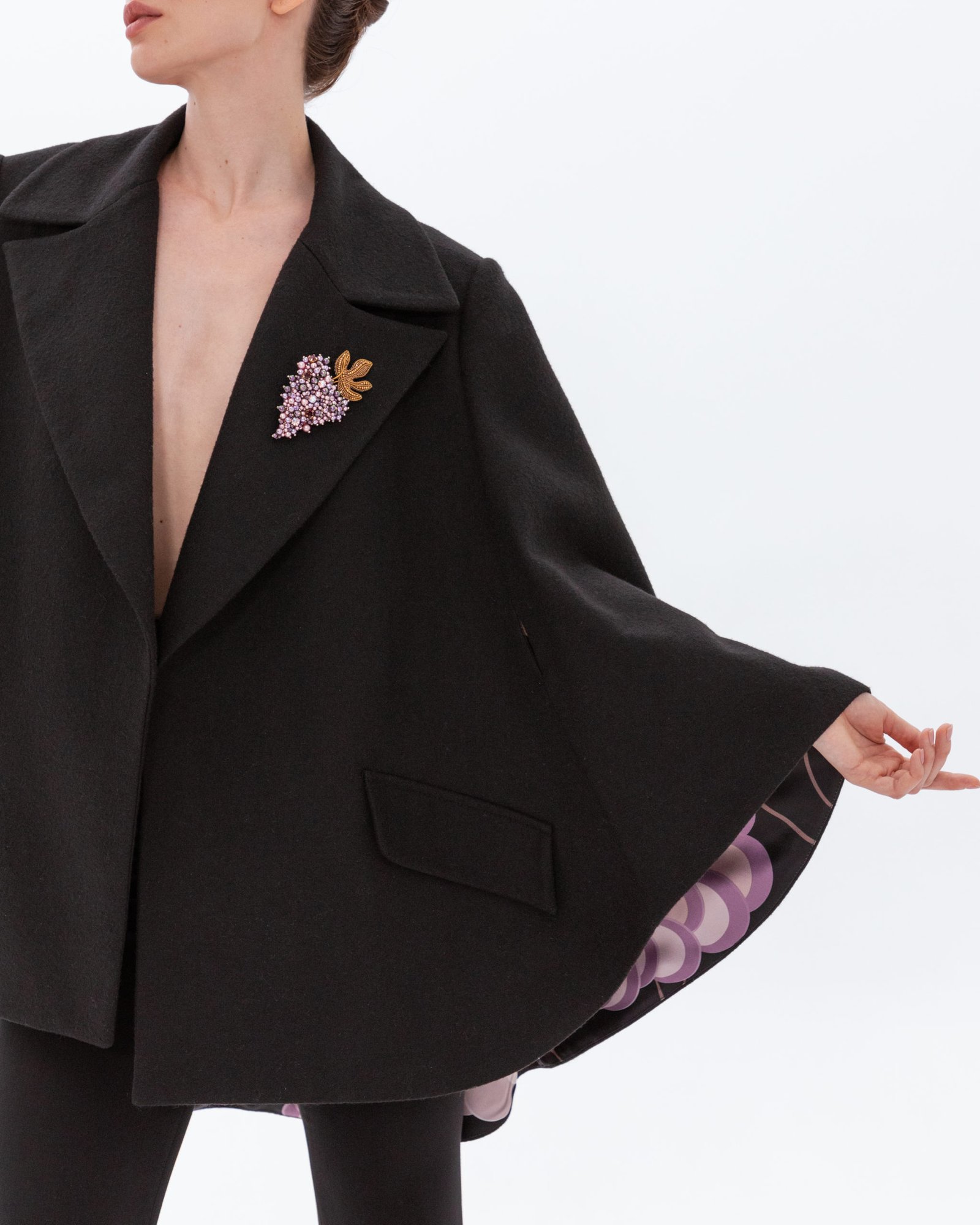 Розкішний кейп, із відворотами, лацканами та двома клапанами спереду.