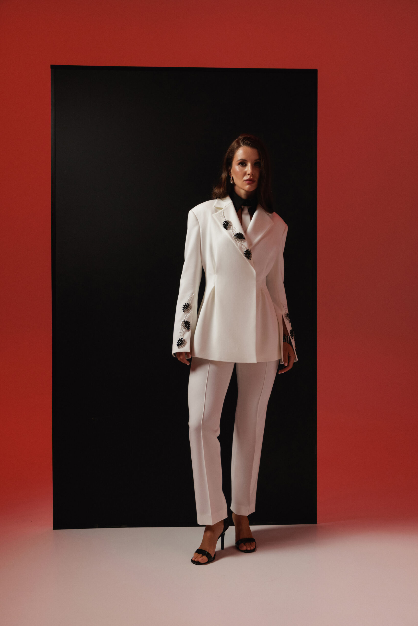 Білий костюм із ручним оздобленням — гармонія форми й сили деталей.