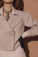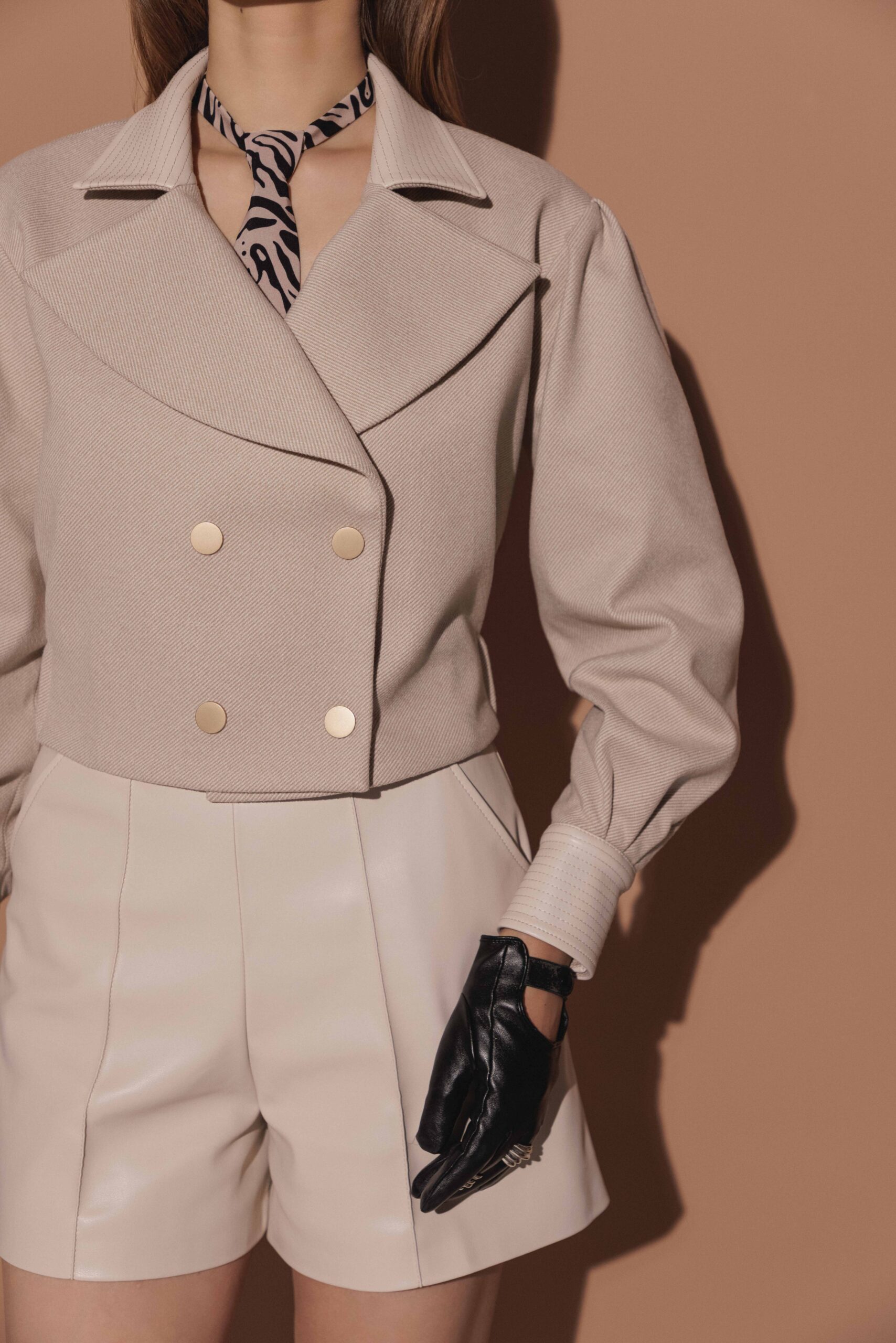 Двобортний вкорочений жакет, із широкими лацканами та опущеною лінією плеча.